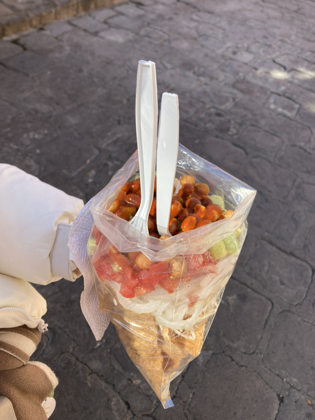 이틀 전 멕시코시티에서 충격을 안겨준 길거리 도리토스도 재도전하기로 했다. 여전히 많은 사람들이 그 봉다리를 들고다녔기에, 과연 그 가게만의 문제였는지가 궁금했다. 이번에는 최소한 감자칩 상태는 훨씬 괜찮았고, 토핑도 훨씬 풍성하게, 즉석에서 올려주셨다.
