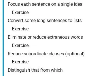 한 문장에는 하나의 아이디어를 담는다는 원칙에 따라, 종속절이 주절과 별개의 내용을 다룬다면 각각의 문장으로 분리하자. 하지만 종속절이 주절의 의미를 보충설명한다면(extend), 그 종속절은 필요한 요소일 수 있기에 무분별하게 없애지는 않도록 주의하자. 그 연습을 아래 Exercise를 통해서 할 수 있다.