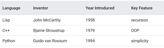 - The following table identifies the inventor, year of invention, and key feature of three popular programming languages:
