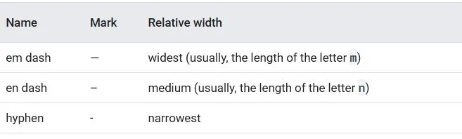한편, 처음 언급한 대로 길이에 따라 em dash 뿐만 아니라 en dash와 hyphen도 있다.