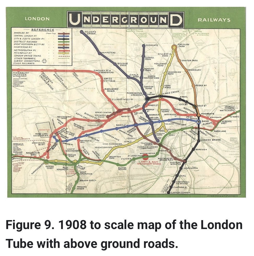 예를 들어 1931년 이전의 런던 지하철 지도는 아래와 같이 도로와 선로의 커브, 축척까지 너무 디테일한 요소들까지 반영되어 시각적으로 복잡했다.