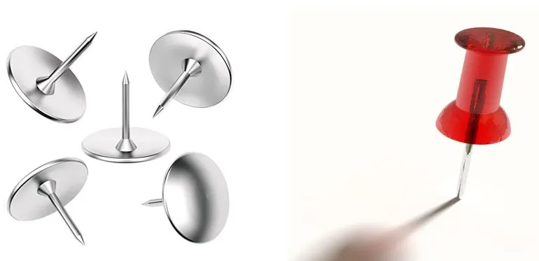 Pushpin (푸시핀): 모양은 thumbtack과 비슷하지만, 머리 부분이 둥글거나 길쭉한 플라스틱 손잡이처럼 생긴 핀.