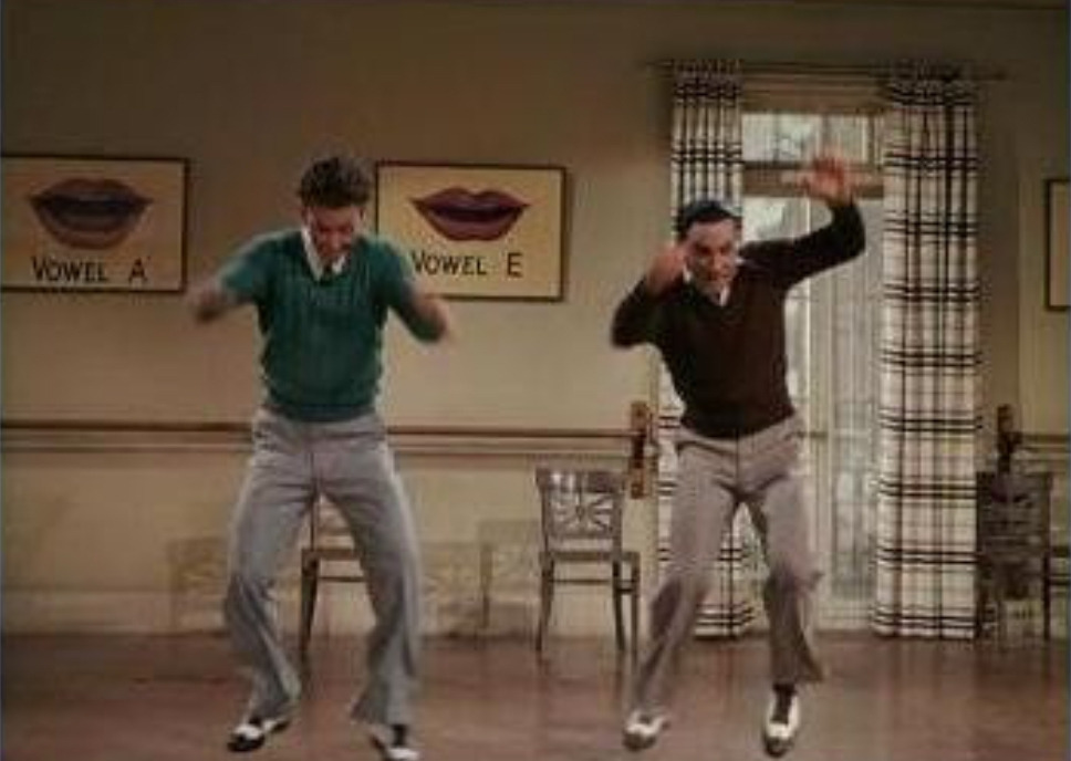 <사랑은 비를 타고>는 유성영화 시대의 도래로 영화에 있어 청각적 요소인 음향이 시각적 이미지만큼이나 위치와 중요성이 증대된 것을 보여줄 뿐만 아니라 무성영화의 특징 또한 드러낸다. 돈과 함께 영화촬영장을 다니는 코스모는 돈 앞에서 ‘Make’Em laugh’라는 경쾌한 노래를 부르며 음악에 맞추어 열정적으로 춤을 추는데, 열정적인 춤을 추는 한편 지나가던 자재에 머리를 맞거나 벽을 뚫는 등 어설픈 실수를 하는 그의 모습은 무성영화 시대를 대표했던 찰리 채플린의 모습을 연상시킨다. 춤을 추는 도중 그는 세트장에 놓인 복도 모양의 판을 타고 올라가는 행동을 보이는데, 이는 실제로 들어갈 수 있을 것처럼 보이던 복도 공간이 2차원 평면적인 세트판이었음을 드러내며, 영화의 2차원적 성격을 보여주고(세트장과 영화의 2차원적 성격이 어떤 관계가 있는지는 조금 더 생각해 보면 좋을 것 같아요!), 버스터 키튼의 <셜록 주니어>를 연상시키기도 한다. 무엇보다 슬랩스틱과 같은 몸짓으로 그가 부르는 노래의 가사처럼 웃음을 유발하는 해당장면은 청각적 요소와 시각적 요소의 일치를 보여주며, 이러한 청각적 요소와 시각적 요소의 일치는 몸과 표정과 같은 비언어적 표현으로 서사를 이끌어갔던 무성영화의 특징을 다시금 떠올려보게 한다.