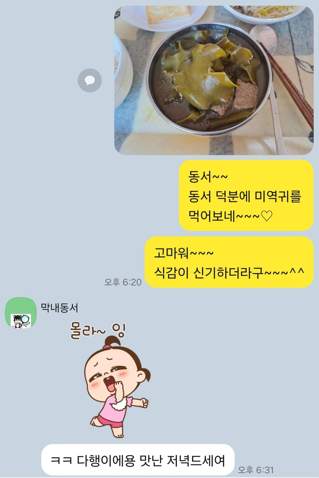 동서 덕분에 '미역귀'란 것을 다 먹어보게 되었다. 처음 접하게 된 식품이라해도 요즘은 상관없다. 손안의 컴퓨터에게 물어보면 되니까. 요녀석은 모르는 것도 없다. 검색해 보고 미역국에 넣어서 끓일 수 있다는 것을 알게 되었다. 며칠뒤 미역국을 끓이고 사진 한 장을 찍었다. 그러곤 잊고 있다가 갑자기 오늘 생각이 나서 동서에게 톡을 보냈다.