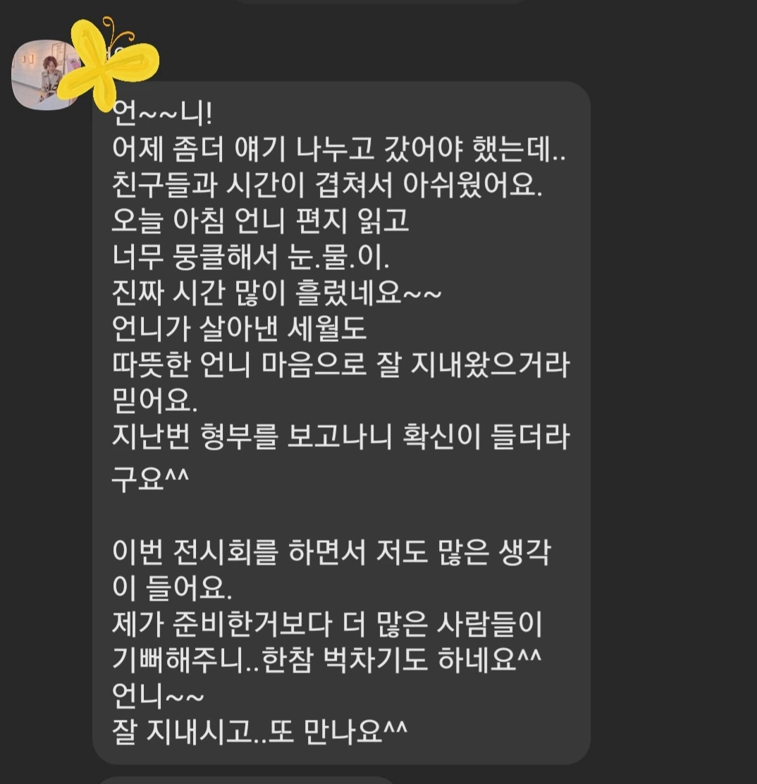 역시 후배는 환한 미소로 맞아주었다. 손님들 챙기느라 바빴다. 짧은 만남을 뒤로하고 전시장을 나오는데 뭔가 내 마음에 아쉬움이 남았다. 이렇게 어렵게 우리가 만났는데 이 정도 대화밖에 못 나눴구나...