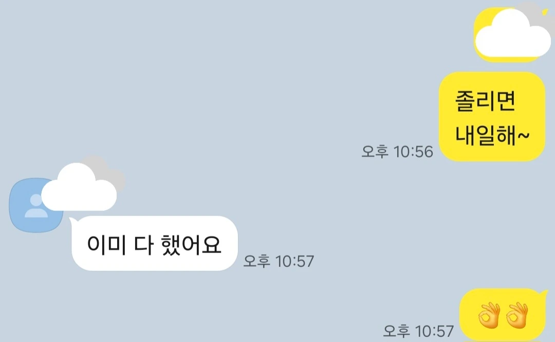 "그럼~ 근데 너무 늦지 않았으면 좋겠어."