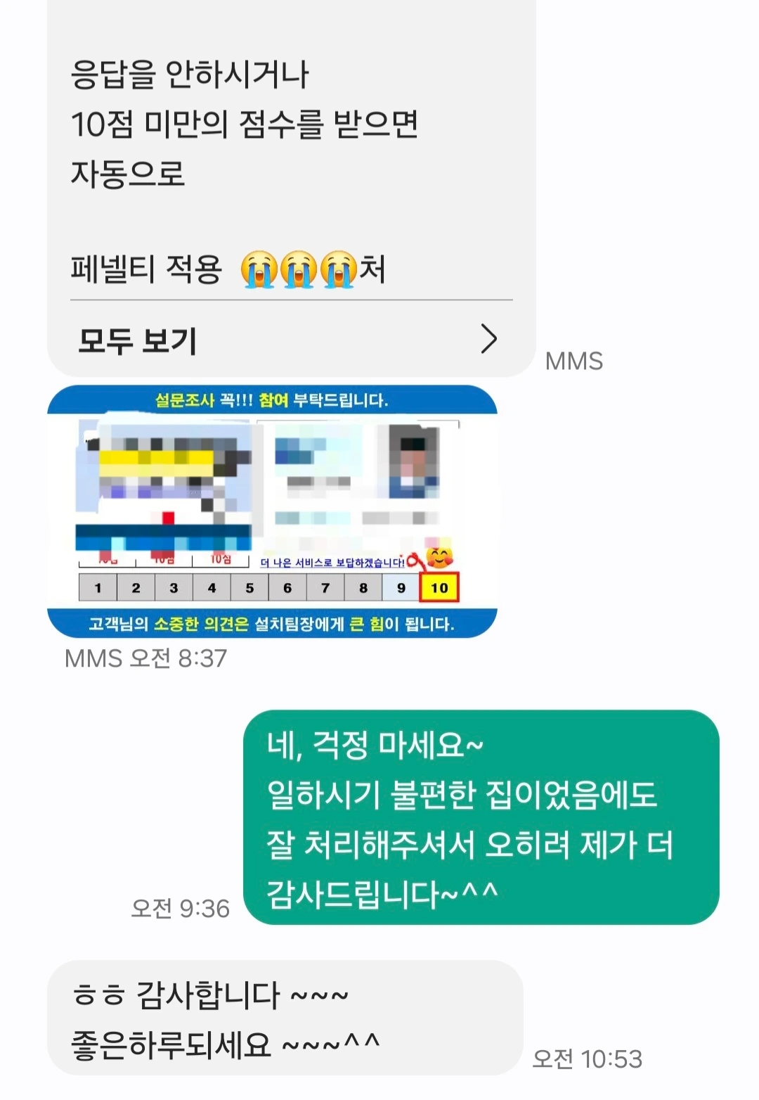 꼭 그리 생각할 일은 아니겠지만 평가가 뒤따르는 서비스여서 일 수도 있겠다..라는 생각을 해봤다. 오래된 집의 불편한 구조를 감수하면서 예상 못한 상황에 능숙한 대응까지! 배달 기사님이 어쩜 이리도 친절할까...라고 생각했었는데 이유가 있었구나..라고 생각이 미치지 않을 수 없었다. 무엇이 선이고 무엇이 후인지 모르겠지만 고객의 입장에서 보면 친절한 응대를 받으니 기분이 좋았던 것은 사실이다. 하지만 순수한 친절이 이렇게 곡해될 수도 있는 상황이 좀 아쉽긴 하다. 난 그냥 순수하게 배달 기사님께 고마움을 갖기로 했다. 배달 마치고 돌아가는 길에 서비스 평가에 대한 마지막 당부를 하고 떠났다. 그러곤 다음날 좋은 평가 부탁한다는 문자를 또 보내왔다. 흠.. 이런 걸 감정노동이라고 하나보다.