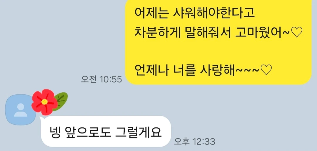 "엄마 지금은 샤워해야 할 것 같아요. 어제 펜션에서 씻긴 했는데 뭔지 좀 찝찝해요~"