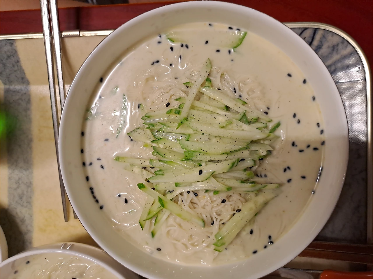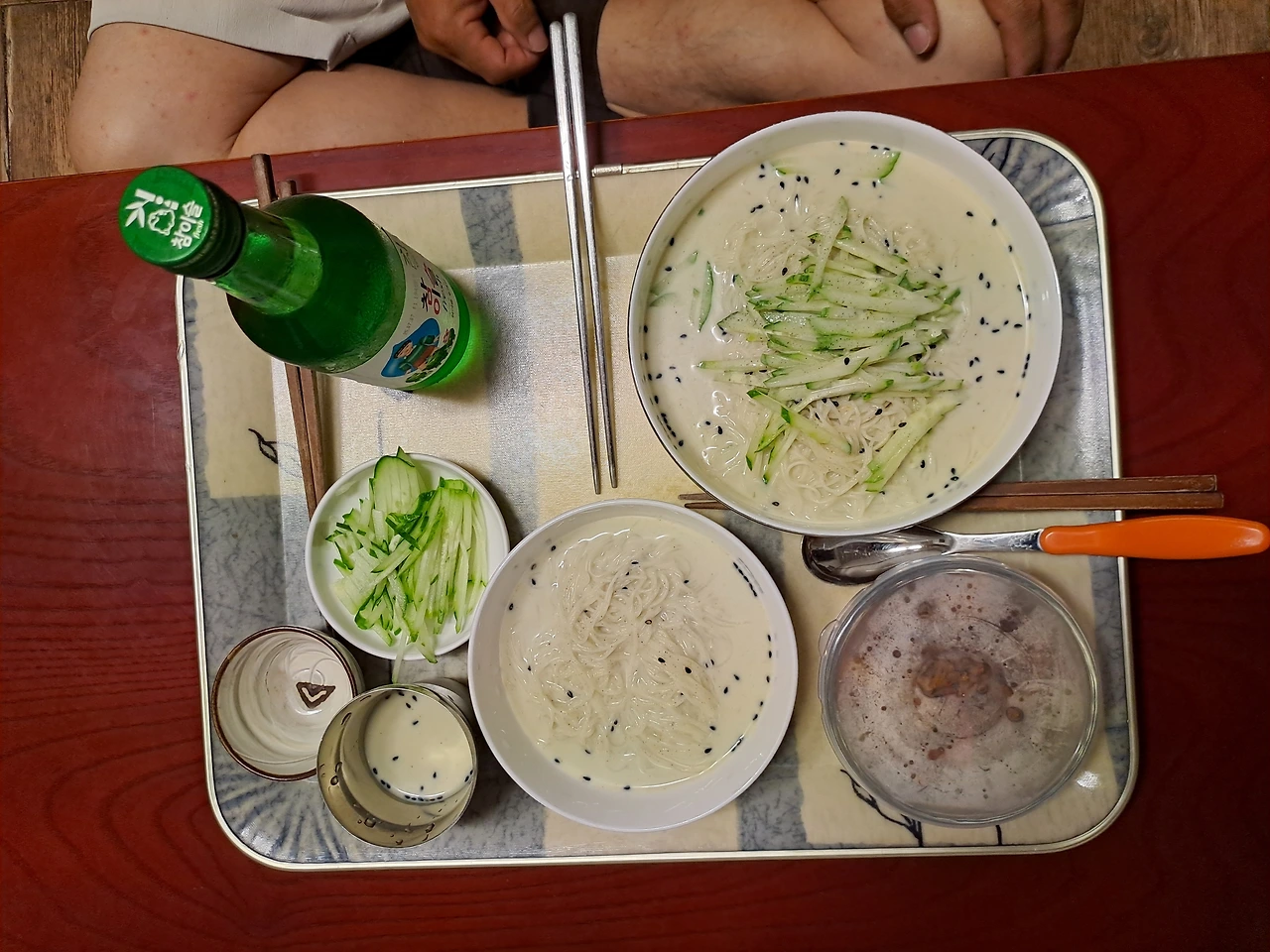 모든 것은 기우일 뿐이었다! 신세계였다. 살짝 단맛이 풍겨 나오는 콩물이 너무 맛있었다. 살짝 맛을 보고 콩가루 세 스푼과 소금을 첨가해 좀더 걸쭉하게 농도를 조절했다. 냉장고에 잠시 넣어두고 면을 삶았다. 신바람이 나서 밤 9시가 넘은 그 시간에 면을 삶는데도 하나 귀찮지가 않았다. 이걸 남편과 큰 아이에게 맛 보일 생각에 신이 났다. 마지막으로 오이를 채 썰어 올려주었다.