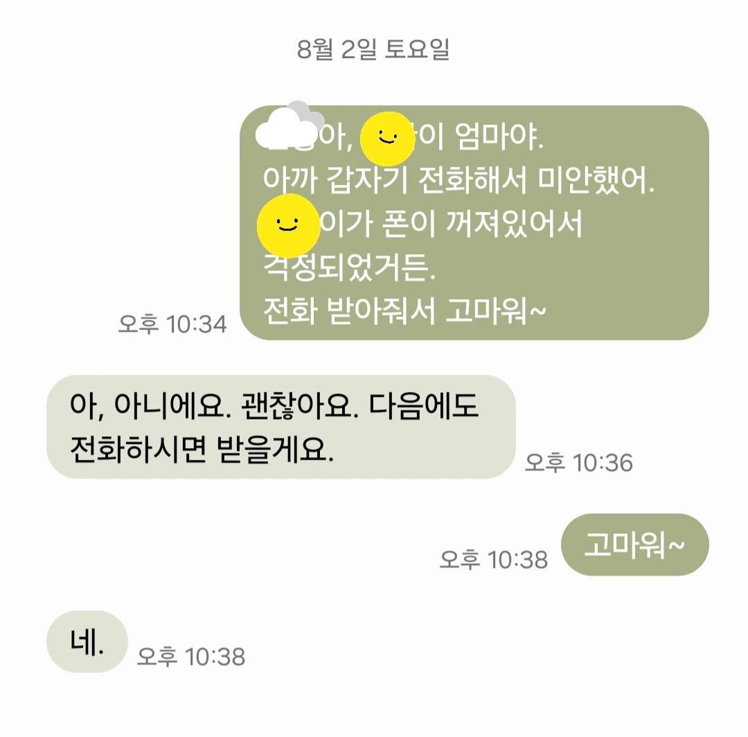 아무 일 없음이 확인되자 다짜고짜 용건만 말한 것이 미안해졌다.