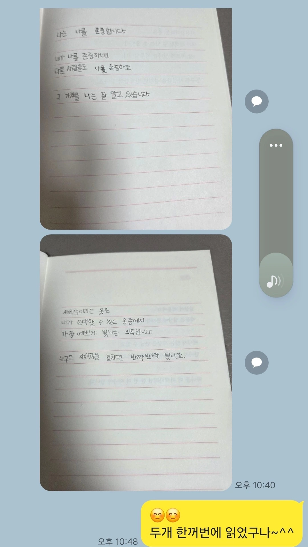 "○○야, 선생님이 ○○ 생각하면서 책을 샀는데 하루에 하나씩 읽고 맨 마지막 부분을 필사해서 선생님한테 톡으로 보내주는 거야. 선생님이 ♤♤이(우리 집 큰 아이)랑 3월에 엄청 싸웠다고 했잖아. 그때 누군가 말해줘서 우연히 필사를 해보았는데 마음이 진정되더라고. ○○도 한 번 해볼래? 하고 싶지 않으면 하지 않아도 돼. 선택은 네 몫이야~"