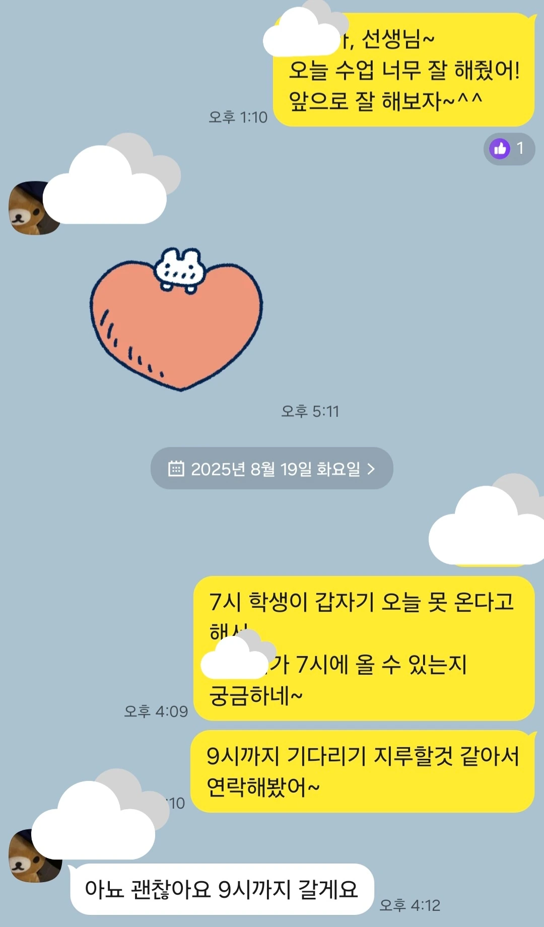 오랜만에 만난 이 설렘. 내게 기분 좋은 설렘을 안겨준 네게 너무 고맙구나. 엄마 말로는 네가 4차원이라며 선생님을 힘들게 하더라도 양해를 바란다는 의사를 간접적으로 보내주었지만, 내가 바라본 너는 자기 의사가 분명하고 아는 것과 모르는 것이 명확한 아주 괜찮은 학생이야. 2시간 수업을 진행해도 흐트러지지 않은 자세와 집중력을 엄마는 모르겠지. 난 그 모습에 또 에너지를 얻고 힘을 내게 된단다. 너에게 고마운 이유야.
