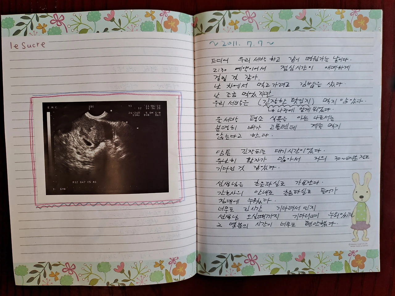 선생님은 초음파실로 가보란다. 간호사의 안내로 초음파실로 들어가 누웠다. 너무도 긴 시간 기다려서인지 선생님 오실 때까지 기다리며 누워있던 그 몇 분의 시간이 너무도 편안했다.