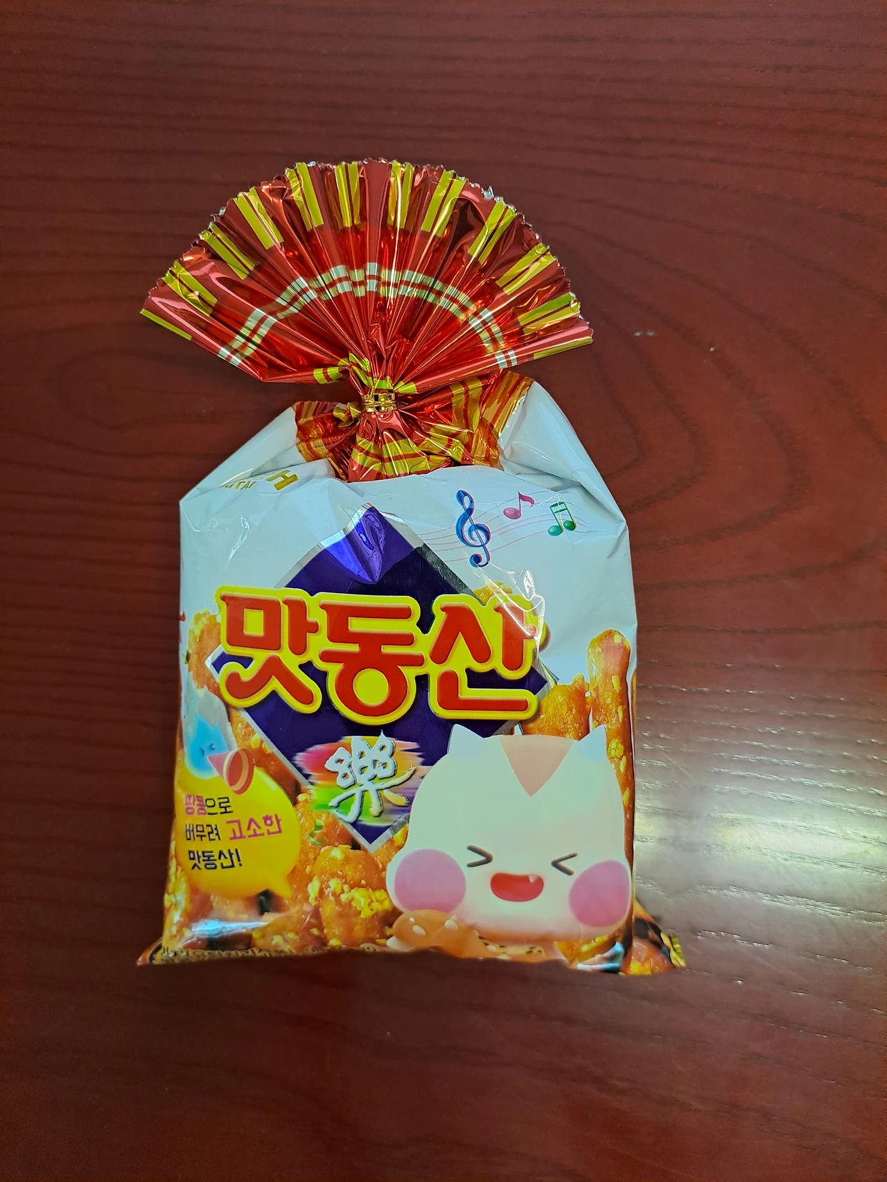 가방을 뒤적이다가 맛동산 봉지가 보인다. 방과 후 시간에는 선생님들께서 준비해 나눠주시는 젤리나 작은 초콜릿 과자 같은 것을 받아오곤 하는데 이렇게 과자를 한 봉지 통째로 받아오는 것은 드문 일이기에 물었다.