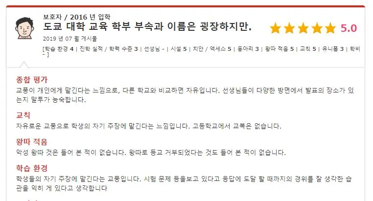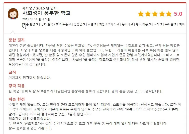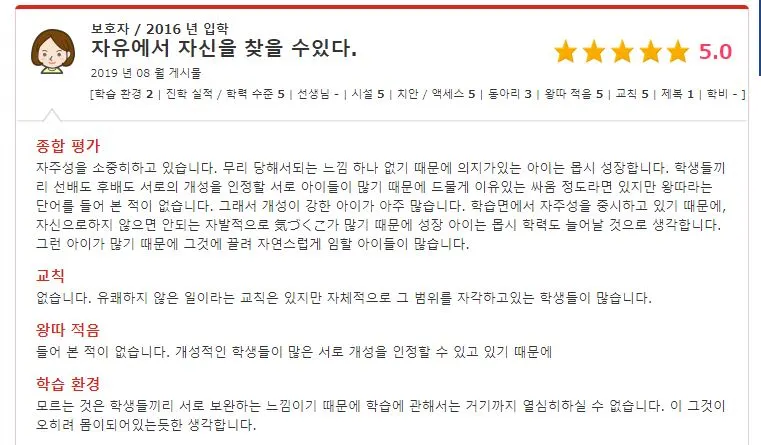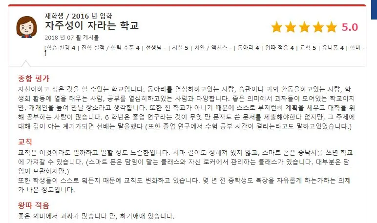 학교의 평가. 사회성, 자율설, 자주성이 뛰어나다는 평가가 많이 보인다.