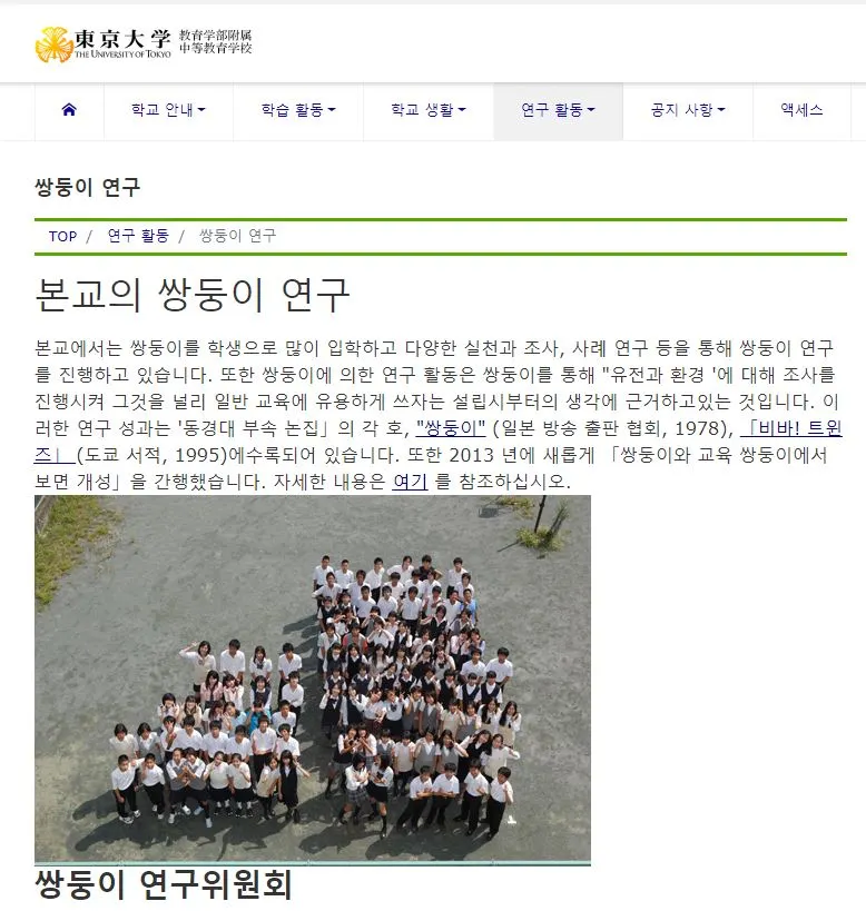 이 학교의 가장 특이한 점은 세계에서 유일하게 쌍둥이의 교육 발달 상황을 연구하는 학교다. 따라서 학교 입시에는 쌍둥이 특별전형이 있다.