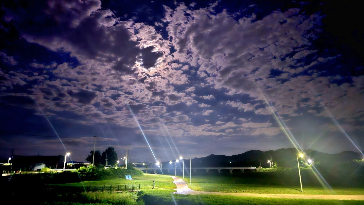 걷는 신송교 부근에 로시난테를 세우고 걷는다리 중간쯤에 서니 하늘은 구름과 달의 절묘한 조화로 나를 환영해준다. 불가마 같은 찌더움도 누러진 시간이라 달하고 나하고 구름하고 나하고 무심천하고 나하고 그렇게 달밤을 흥얼거리고 놀았다. 얼마나 근사한 환영의 밤인지. 늦은 밤이니 운동하는 도보맨들도 없으니 완전 나의 독무대였다.