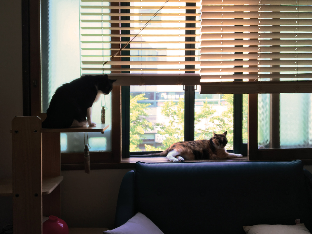 새로운 집에는 아주 크고 햇빛이 잘 들어오는 창문이 있었다. 두 겹의 창문이 들어찬 나무 창틀이 한 뼘만큼 넓어서 오로와 조로가 사이좋게 앉아 바깥 풍경을 바라볼 수 있었다. 창 앞에는 나무로 만들어진 손때 묻은 캣타워와 새로 산 청록색 소파를 나란히 뒀다. 고양이들이 창틀까지 올라가는 안정적인 통로가 되어주리라.