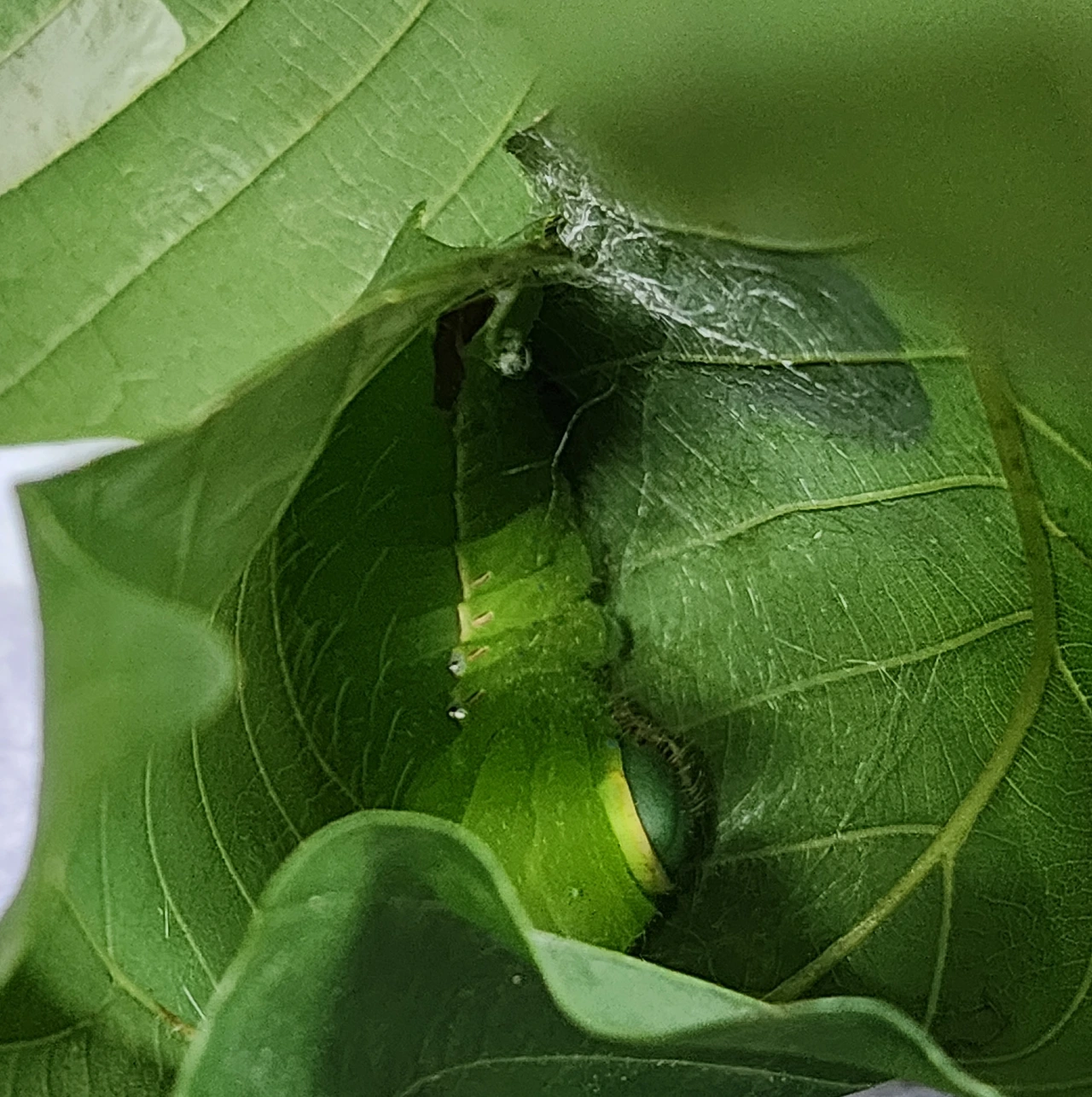 식음을 전폐했다는 건 이제부터 긴장을 해야한다는 의미입니다. 하루가 더 지났습니다. 밤새 좌우, 상하로 머리를 흔들어대며 열씸히 실을 뽑아대더니만 어느덧 아담한 신혼집이 완성되었습니다. 이제 애벌레는 살을 찢는 듯한 용화와 번데기 과정만 남았습니다. 요람속에 들어가 버리더니 옴짝달싹도 하지 않습니다.