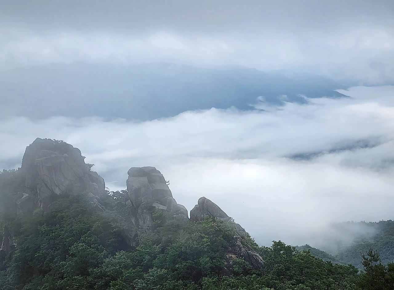 마음은 오르려하고 육신은 버벅대기를 몇 번째. 이 순간에도 무언가 하나라도 붙잡을 수 있다는게 얼마나 고마운건지. 고단한 인생길에서도, 이 끝없이 이어지는 마루금길에서도 이렇게 붙잡고 기댈 수 있다는 건 분명 행운이었다. 코를 바위에 쳐박을 듯 직벽바위를 네발로 기다시피 겨우 올랐다. 신선계였다. 인간계는 저 먼발치 발아래 운무에 묻혀 있었다. 천하일경이 따로 없었다. 갑자기 안견의 몽유도원도가 떠올랐다. 안평대군이 꿈에서 보았다는 그 이상향 세계.