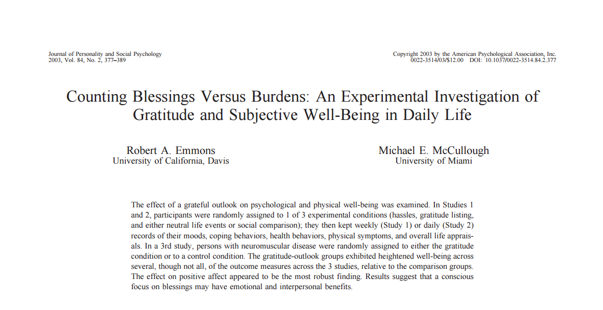 첫 번째 그룹은 감사 그룹인데, 그들이 받았던 지침은 이것이야. "우리의 삶에서는 큰 일이건 작은 일이건, 그것에 감사할 만한 많은 일들이 생깁니다. 지난 한 주를 돌아보세요. 그리고 당신의 삶 속에서 감사하게 생각되는 일 다섯 가지를 적어보세요."
