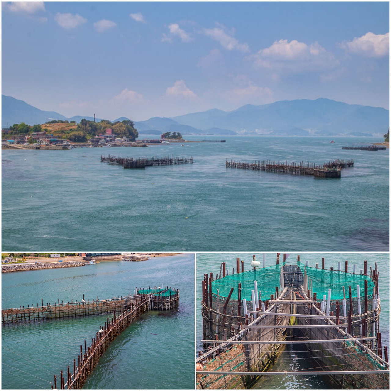 삼천포 해안 군데군데에 긴 장대를 꼽아 만든 죽방이 있어서 운치를 더한다.