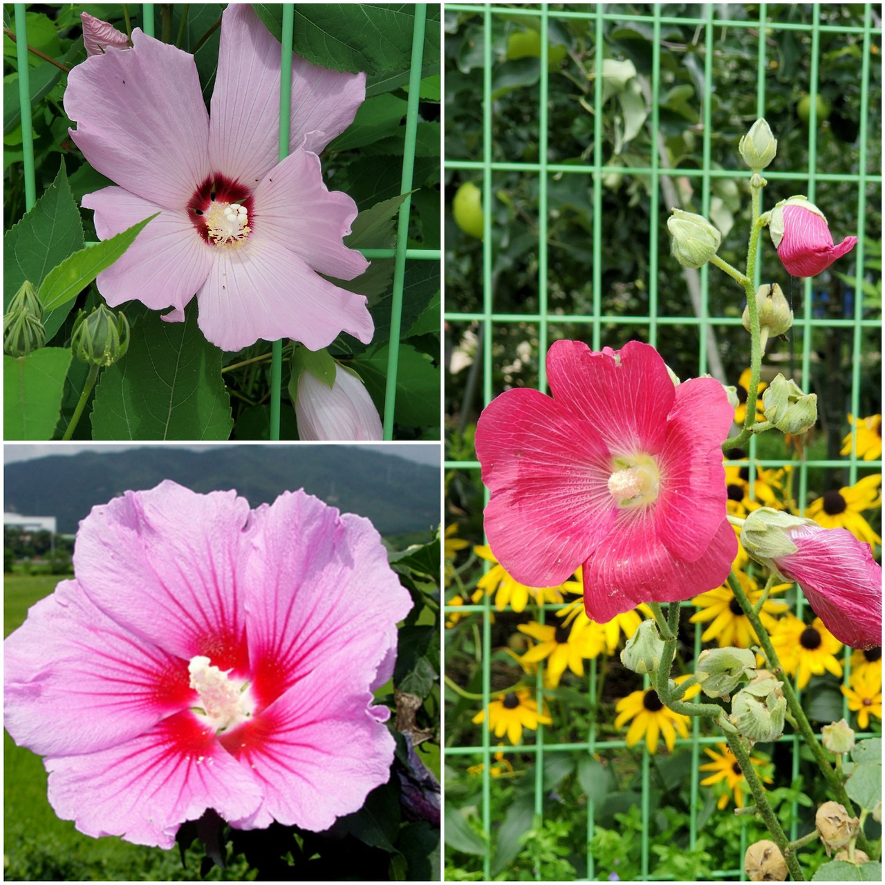 왼쪽 위 부용화, 왼쪽 아래 무궁화, 오른쪽 접시꽃