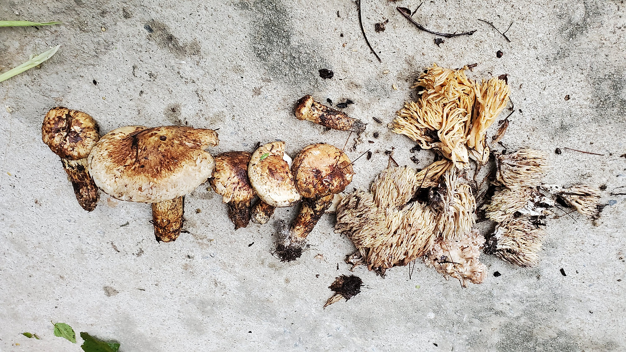 송이버섯 6개와 싸리버섯. 8월에 송이 채취라니 언제 다시 경험해 볼 수 있겠는가?