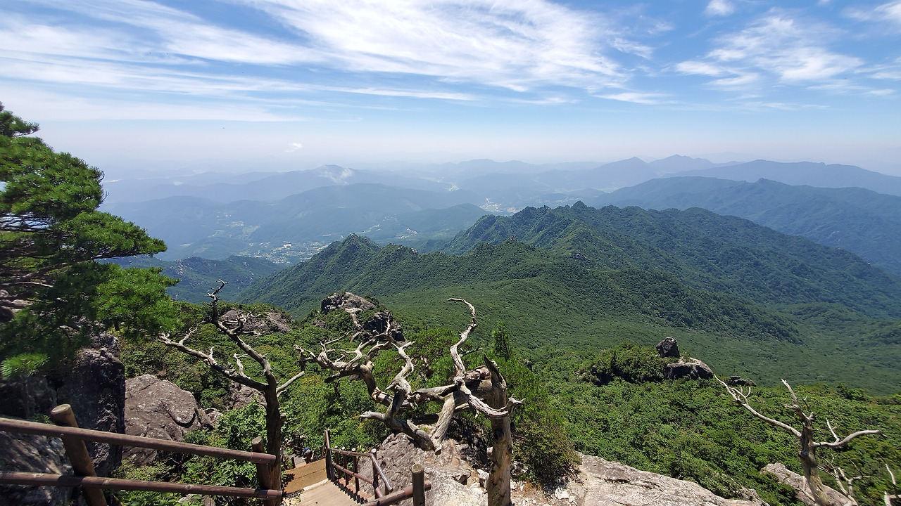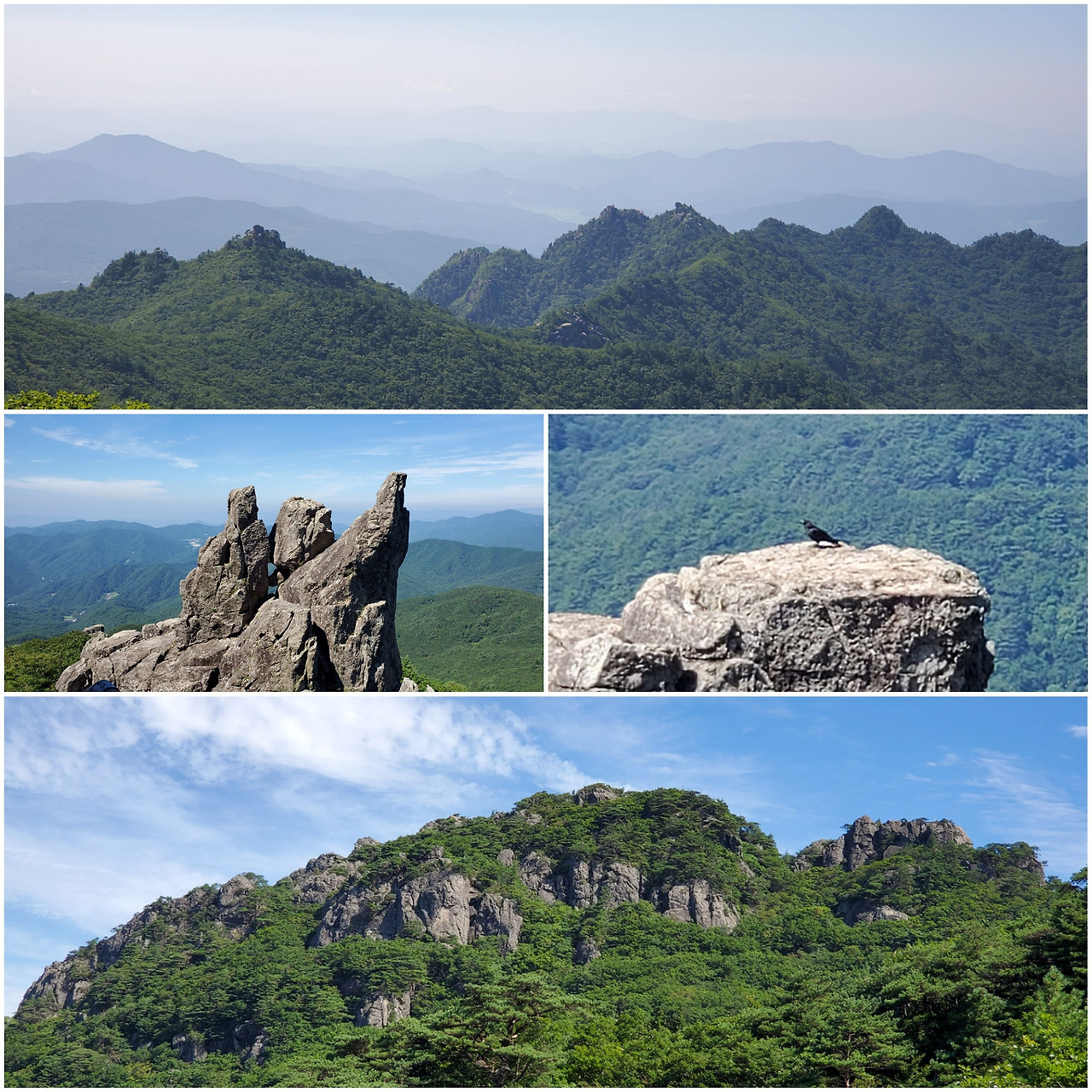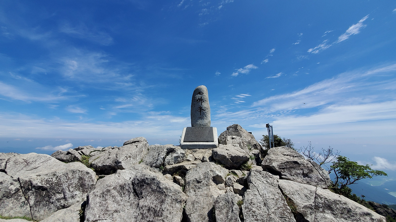 흐르는 땀을 닦아가며, 나무데크를 지나고 계단을 올라가서 마침내 가야산 상왕봉에 도착했다. 해발 1,430m 정상에서 함께 기념사진을 찍었다. 하늘은 푸르고 산들은 녹색잎으로 덮였는데 상왕봉 정상은 바위 투성이다.옛적부터 산 정상에서 산신제로 소를 제물로 바치고 신성시했다고 해서 우두봉이라고도 불리는 상왕산은 도리봉, 비계산, 남산, 북두산 등 해발 1,000미터가 넘는 고봉을 거느리고 경북 성주군과 경남 합천군의 남북 경계선에 위치한다. 상왕봉은 합천군에 속한다.