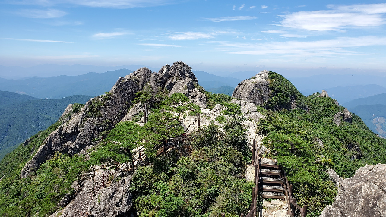 옛날 독신 때 교회 모임으로 가야산을 오른 적이 있었는데, 그때에 비하면 등산길이 많이 수월해졌다. 돌밭을 잘못 디뎌서 발을 삐끗하는 경우가 여러 번 있었는데, 지금은 계단길로 잘 다듬어 있고, 가파른 길은 오르기 쉽게 나무데크 시설이 되어있다. 예전엔 젊은 혈기로 올랐던 길을, 나이 든 지금은 좋은 시설이 마련되어 편하게 걸었다. 큰 힘들지 않고 중봉에 올랐다. 이때부터 하늘이 열리고, 흰 구름과 파란 하늘이 우리를 맞이했다.