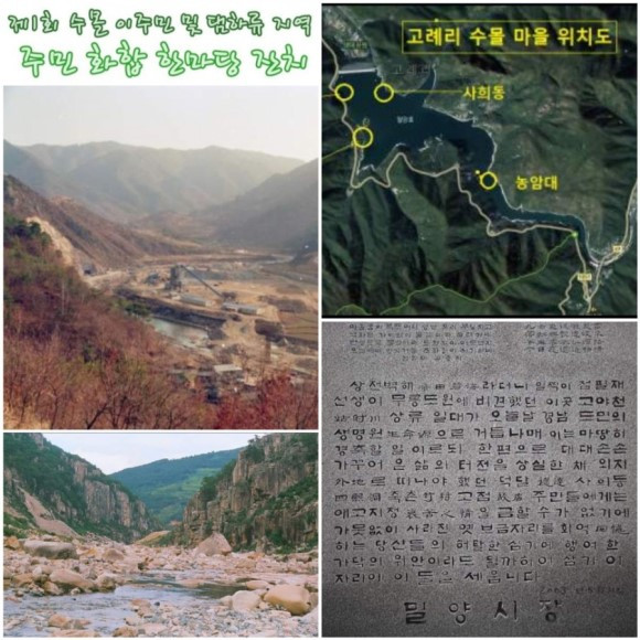 동서 여섯 중에 윗 동서 두 분이 밀양출신이다. 밀양댐 바로 밑 단장면 고례리가 둘째 동서인 손서방 형님의 고향이다. 다행히 고향집은 수몰되지 않았지만 다니던 초등학교와 소싯적에 소풍 가서 놀던 농암대는 댐 속으로 사라지고 없다고 한다. 고례천 상류 계곡의 농암대는 밀양출신 조선시대 성리학자 점필재 김종직 선생이 말년에 머물었던 곳이기도 하다. 깎아지른 절벽에 첨첨이 쌓인 바위와 천 길 낭떠러지가 절경을 이루었고, 그 아래 흐르는 강물은 투명하도록 맑았단다. 그 외 사희동 등 여러 마을이 사라졌다. 밀양댐을 조성하면서 단장면 3개 마을 83가구 267명, 양산시 원동면 고전 마을 11가구 30명이 이주하였다. 이들 이주민에게는 이 곳 고향이 기억 속에 생생히 살아 있을 것이다. 깊은 물속이라 가 볼 수는 없는 고향집이 지금은 물고기들의 아파트가 되고 놀이터가 되었다. 수몰민의 아픔을 달래는 망향비와 정자가 세워고 공원으로 꾸며진 밀양댐 전망대는 지나가는 길손의 휴식공간이 되고 있다.