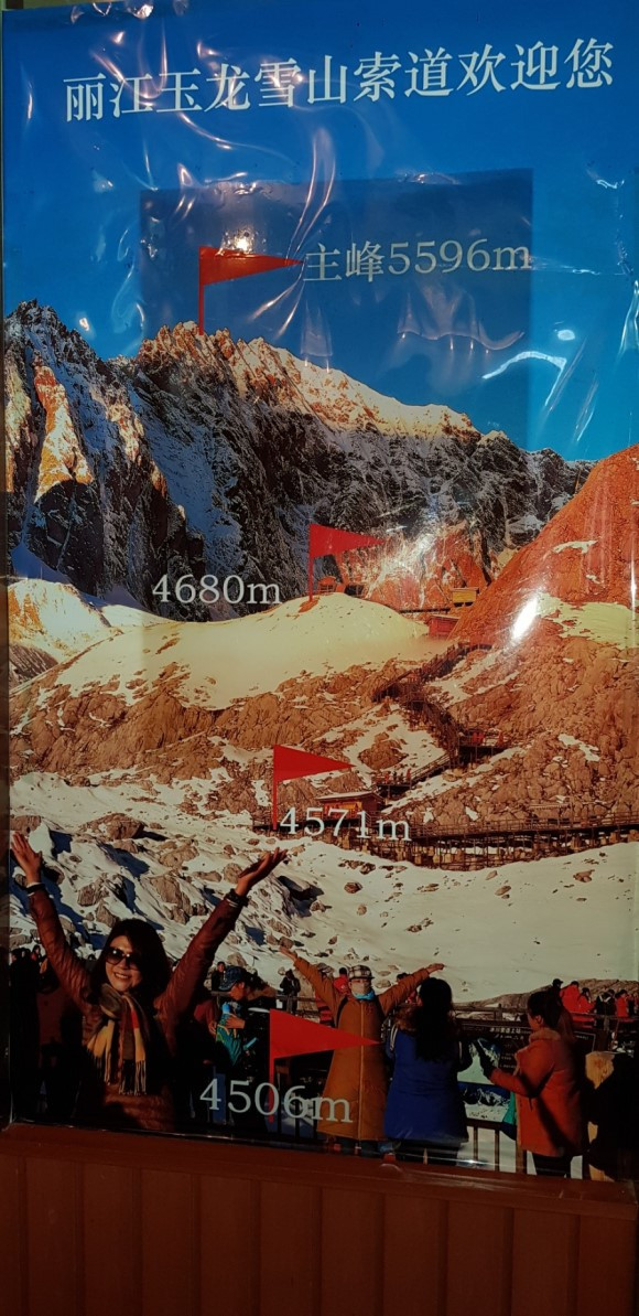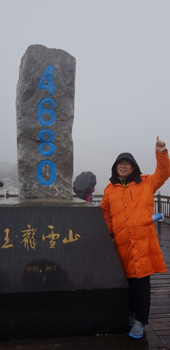 해발 4,550미터에서 케이블 카를 내렸다. 머리가 아프고 다리가 후달리는 고산병 증세는 없었으나 자주 산소통으로 공기를 흡입했다. 접근이 가능한 4,680미터 고지를 오르는 동안 다리가 휘청거리는 순간이 여러 번 있었고 그때마다 산소를 흡입했다. 케이블카에서 내려 겨우 130미터를 오르는데도 여러 번 멈춰 휴식을 취하여야 했다. 전문 산악인들이 에베레스트 정상 부근에서 하루 200, 300미터 밖에 전진할 수 없는 경우는 어렴풋이 이해할 듯하다. 옥룡설산 4,680미터 이정표에서 기념사진을 찍고, 왔던 길로 하산했다.