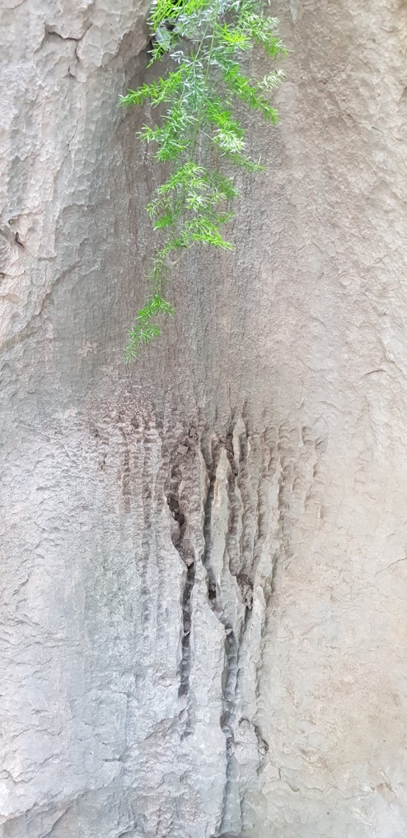 마침 빗물이 흘러내려 바위가 갈라지고 있는 곳이 있어 사진을 찍었다. 석림이 형성되는 과정을 한눈에 보여 주는 예라 하겠다.