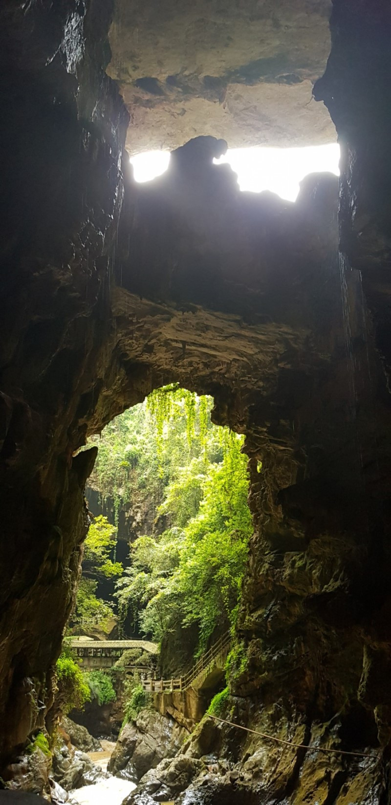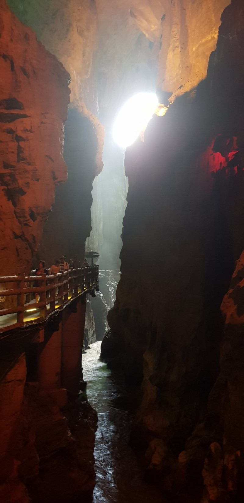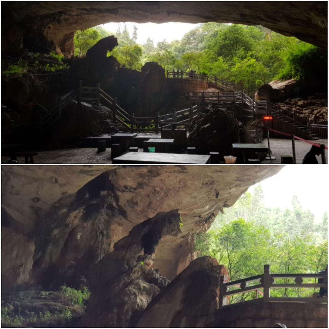 엘리베이터를 타고 50미터를 내려와서 보트를 탔다. 계곡 사이로 흐르는 강물을 따라가다가 동굴이 형성하는 지점에 내렸다. 계곡 양쪽 중간중간 종유석이 형성되어 있다. 계단을 이용해 동굴 입구로 내려오면 엄청난 크기의 지하동굴을 만난다. 구향동굴이 중국 내에서 가장 큰 동굴이란다.