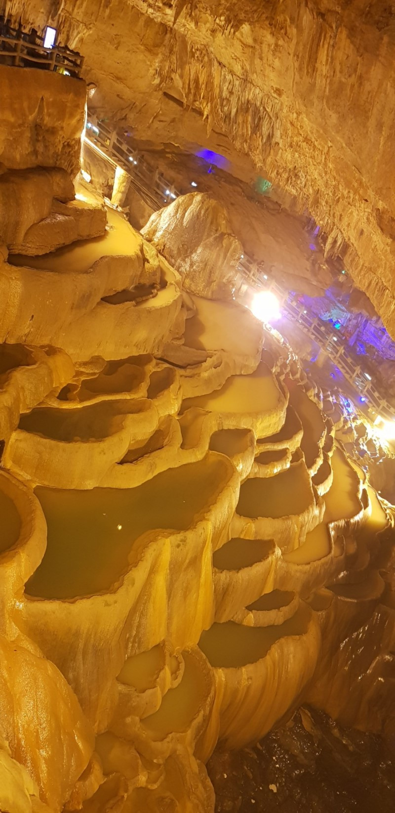 연면적이 167 평방 킬로미터나 되는 구향동굴도 일부만 개방되고 있었다. 황토색 계곡 물이 흘러 거대 동굴을 형성했다. 지상으로 노출된 부분과 지하동굴을 반복해서 오가며 감상했다.