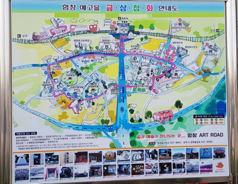 독일 하노버에 가면 시내의 유적지를 모두 이어주는 노란색 페인트가 길에 표시되어 있다. 낯선 도시에 도착한 나는 하노버 중앙 역에서 출발하여 노란색을 따라 천천히 걸으면서 하노버의 유적지를 빠짐없이 쉽게 감상할 수 있었다. 그리고 옛 유럽과 아시아의 이어주는 무역로 실크로드에 위치한 중국 윈난성의 구 도시 아름다운 여강에서 잊지 못할 옥룡설산을 올랐고 맛있는 오골계를 먹었다. 하노이의 노란색 페인트와 무역로의 실크로드를 합쳐 착안한 아트로드가 함창의 여러 볼 만한 곳을 이어준다. 보고 듣고 이야기하고 실제 경험을 할 수 있는 관광지를 안내하는 흰색 가는 줄 표시가 도로에 새겨져 명주실과 같이 길 위에 펼쳐져 있다.