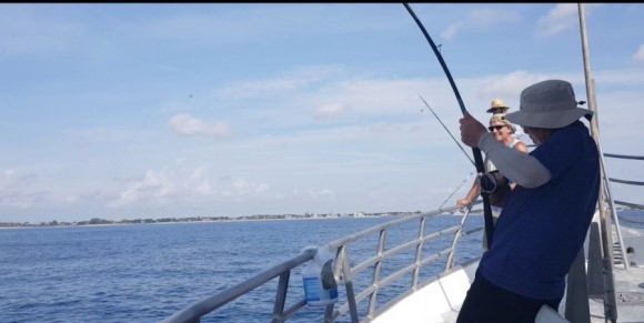 10명 정도의 미국 사람, 히스패닉과 동양인을 태운 철갑선이 대서양을 향해 나갔다. 하늘이 푸르고 뭉게구름이 낮게 드리웠다. 한 25호는 될 것 같은 굵은 바늘 2개로 겹쳐진 낚싯바늘, 손바닥만 한 전어를 통채로 사용하는 미끼, 25호 쯤되는 원줄과 밑줄. 낚시채비가 별났다. 항구에서 한 700미터나 나갔을까? 배의 엔진이 끄지자 마자 일제히 낚싯대가 바다를 향한다.