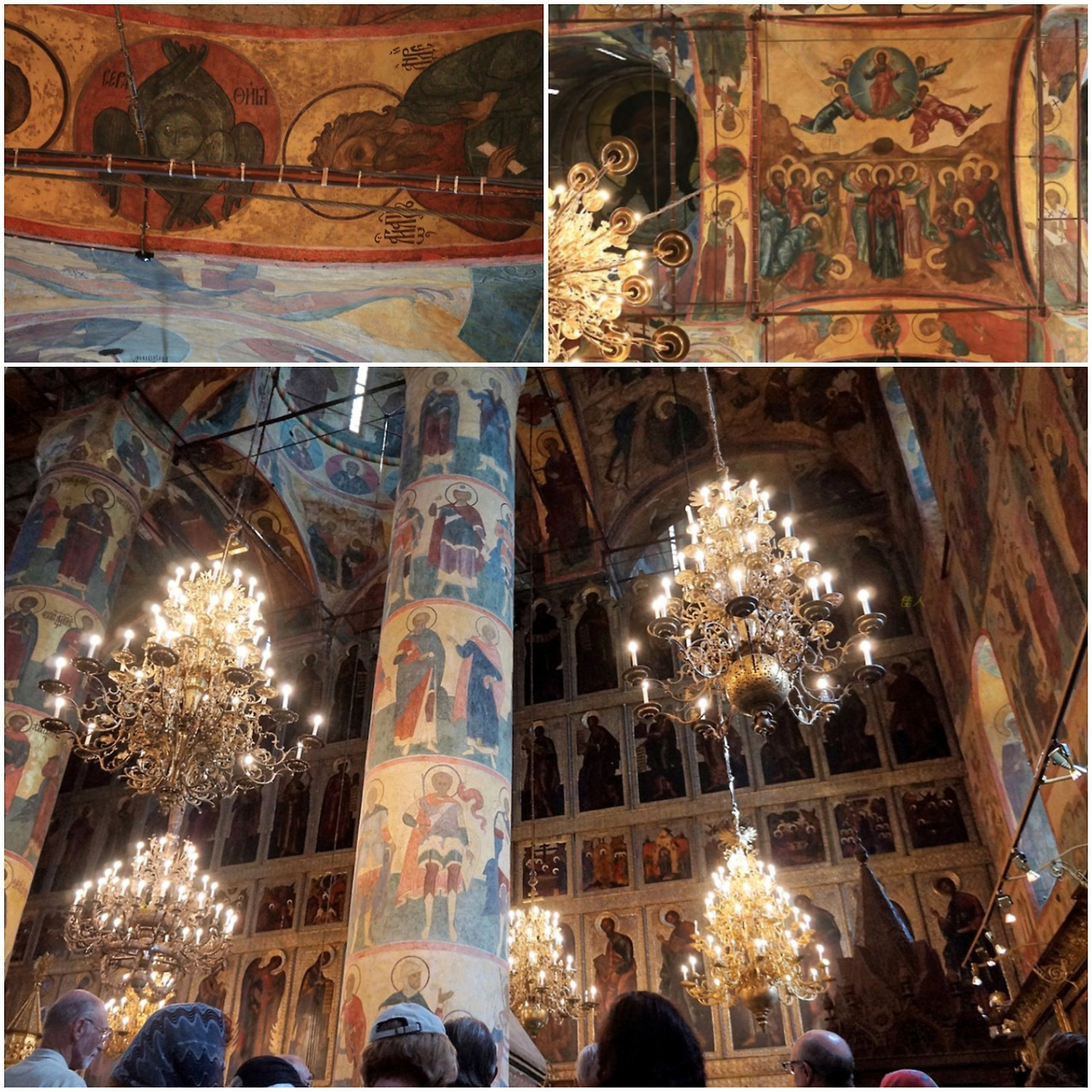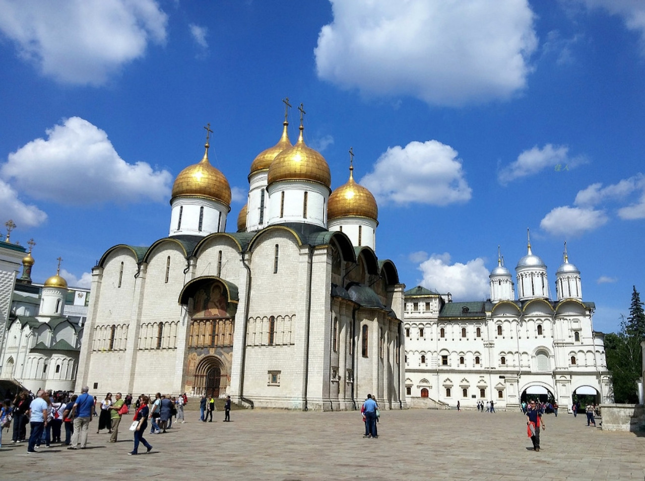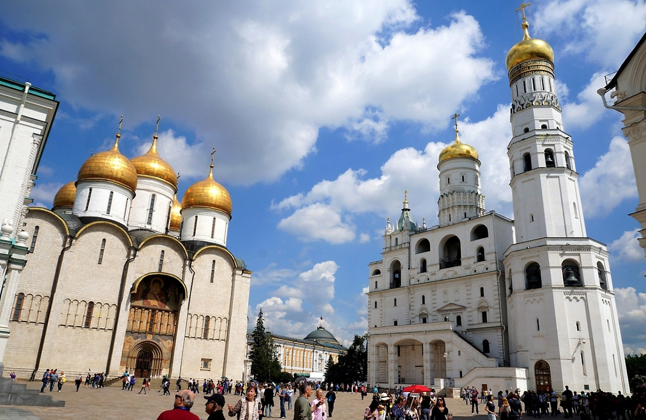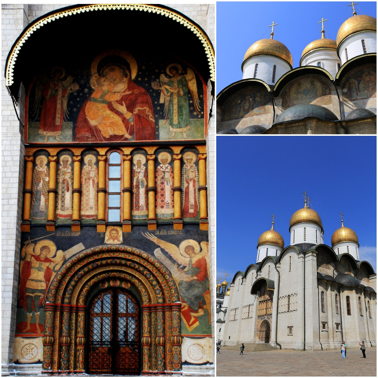 이 중 성모승천 성당은 러시아 최고의 사원으로 국왕들의 대관식이 치러졌고 정교회 총 주교들이 선출되었던 곳이다. 비잔틴 마지막 황제의 딸과 결혼한 이반 4세의 영향으로 로마의 카톨릭과 다른 종파, 그리스도 정교를 잇는 러시아 정교의 전형적인 모습을 보여주고 있다. 외부는 여러 개의 황금색 아치와 그 위에 설치된 십자가는 우리가 아는 일반 십자가와는 모양이 다르다. 십자가 상하단에 예수님의 머리와 발을 뜻하는 수평 막대기가 추가되어 있고, 예수께서 십자가에 달리셨을 때 우편에 있는 죄인의 용서를 받아 주셨던 것과 같이 가운데 긴 수평 막대기의 오른편이 조금 더 올려 우편이 선함을 표현하고 있다. 실내는 성화 이콥으로 벽면 가득 채우고 있다. 4대 복음을 싱징하는 4개의 큰 기둥이 큰 구조물을 버티고 서있고, 천장에 뚫린 구멍 옆에는 성부, 성자, 성신을 뜻하는 3개의 빛이 들어오는 틈새가 있다. 그 천정에는 우리를 내려 보시는 예수님의 얼굴이 그려져 있다.