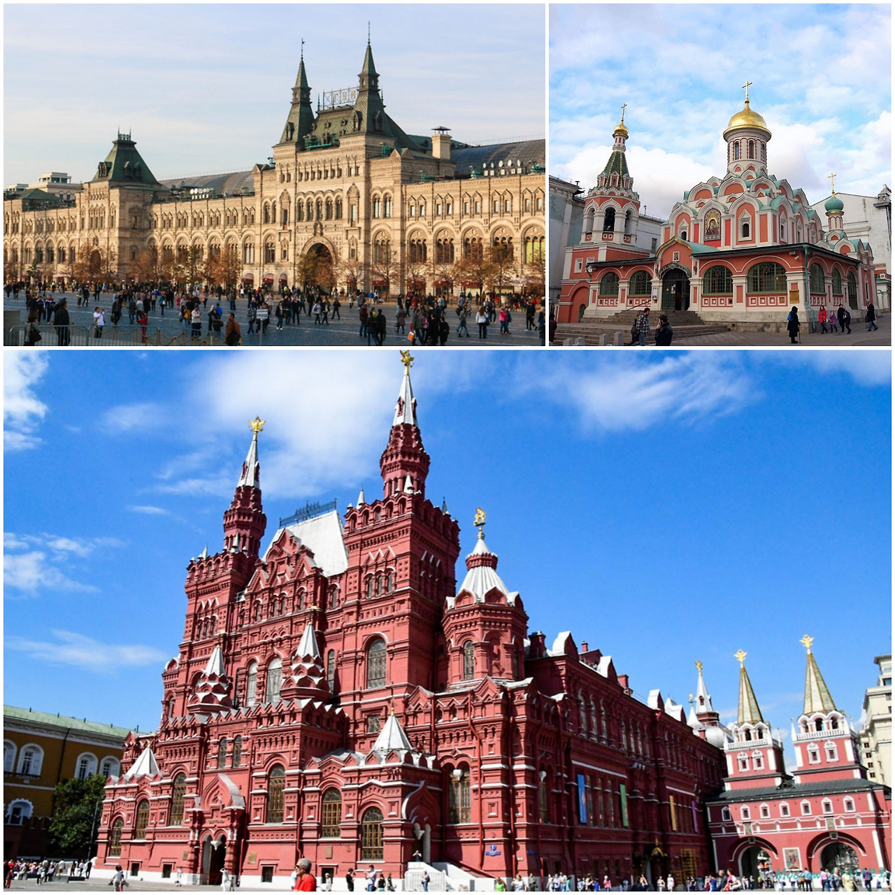 크렘린 성과 바로 연결된 붉은 광장은 러시아 말 '크라스나야'로 '아름다운'을 의미하는 '붉은' 단어를 영어 Red로 표현한 것이어서, 피나 전쟁을 의미하는 것으로 왜곡해 들릴 수 있다. 원래의 명칭이 '아름다운 광장'이었지만 크렘린 궁전을 둘러싼 담장과 광장의 에닌의 표도, 역사박물관도 모두 붉은색이니 '붉은 광장이라고 불러도 무난할 것 같다. 붉은 광장은 국영으로 운영되었던 러시아 최고의 굼 백화점, 레닌의 무덤, 러시아 역사박물관과 러시아 정교회 성 바실리 성당이 사각으로 둘러싸고 있다.
