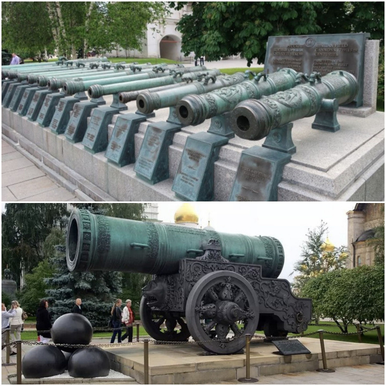 1812년 나폴레옹 군대가 퇴각할 때 버리고 간 프랑스 대포, 아래 차르 캐논(황제의 대포)은 무게 40톤, 대포알은 지름 105cm, 무게 1톤이나 된다.