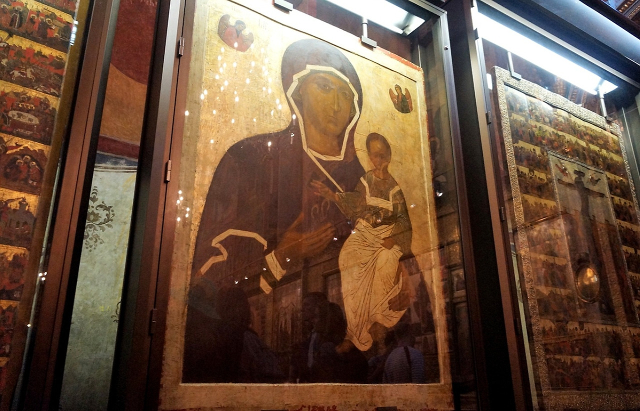 문 위에 있는 카잔의 성모 성화는 러시아에서 가장 숭앙받는 정교 성화중 하나다.
