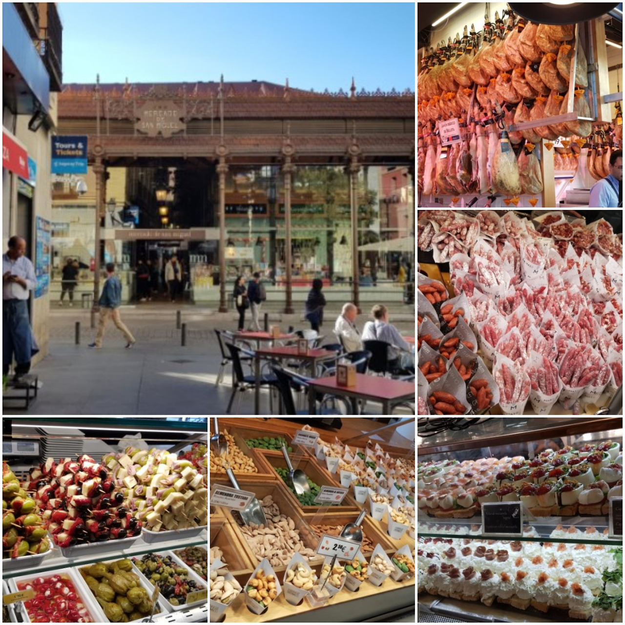 산 미구엘 시장 옆 먹자 식당의 다양한 먹거리, 도토리를 먹인 발톱까지 까만 흑돼지 뒷다리 하몽과 게살과 크림으로 토핑한 빵이 맛있었다.