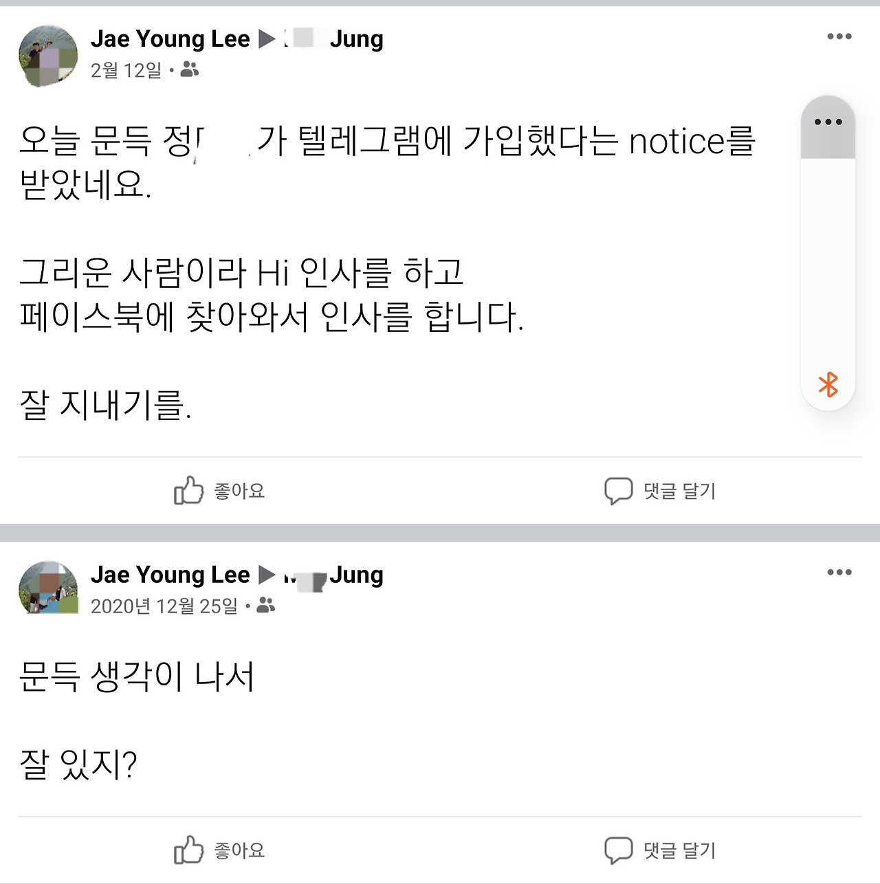 "정 OO님이 텔레그램에 가입했습니다."라는 문자를 받고 깜짝 놀랐다. 마음에 묻어놓고 늘 안타까워하던 정 OO가 기억해 달라고 노크를 해 온 것이다.
