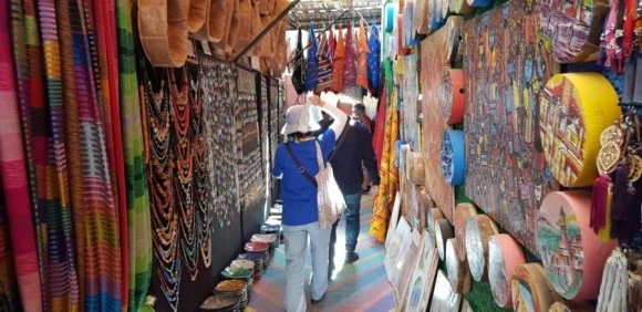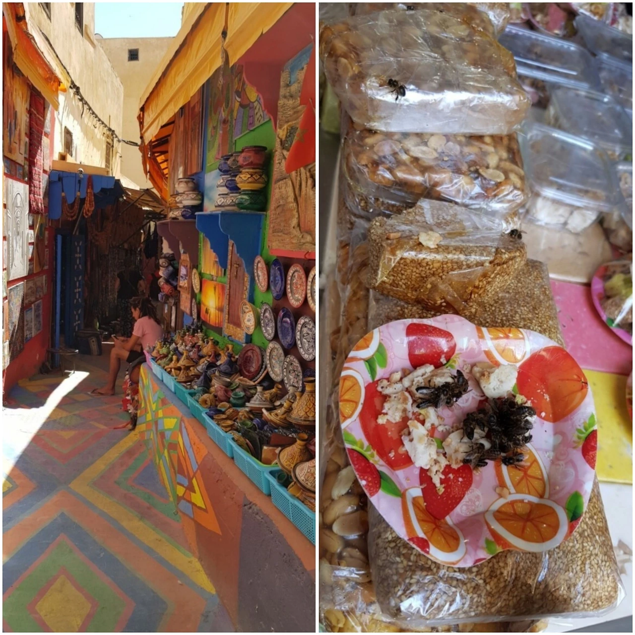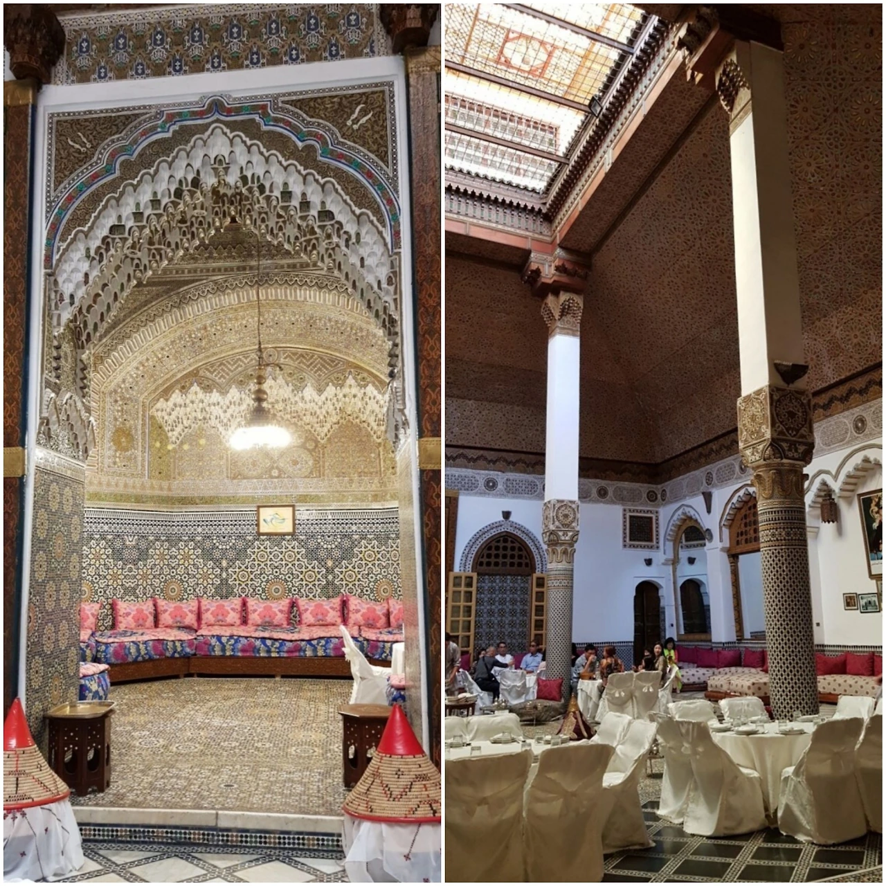 좁은 골목길을 지나다 고개를 돌려 보면, 좁은 공간에서 즉석으로 가죽을 재단하거나 은세공품을 두드리고 아라베스크 문양의 받침대 등을 만드는 장인들의 바쁜 손놀림을 볼 수 있었다. 한 좁은 골목길에서 창살 대문을 세워 출입을 통제하는 식당에 들어갔다. 외부에서 보기와 다르게 건물 내부는 마당에 해당하는 넓은 소통의 공간이 화려하게 장식되어 있었다. 세 벽면을 잇는 또 다른 공간에는 기하학적인 문양으로 더욱 화려하게 치장이 되어 있어 손님을 받는 식당 홀로 사용되고 있었다. 전통적 회교권 가구 구조로 규모와 화려한 장식으로 볼 때 옛 귀족의 집이었을 것이 틀림없다. 이곳에서 무슬림 전통 음식을 제대로 먹었다. 주식인 쿠스쿠스는 좁쌀같이 보이는 세모리나를 곱게 간 것으로 여러 야채와 닭고기가 함께 익혀 나왔다. 과일을 먹은 후 꿀을 섞은 민트차를 마셨다. 일부는 맥주를 시켜 마셨다. 모로코에는 금주령이 없다.
