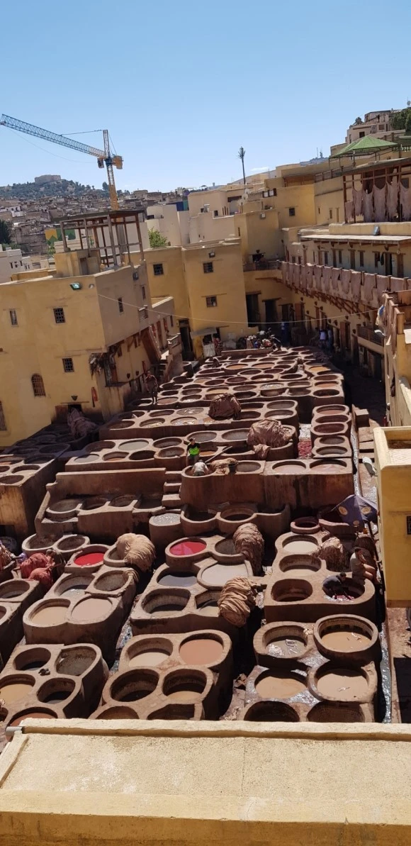 식사를 마치고 세계적 명소가 있는 곳으로 갔다. 유네스코의 세계 문화제로 등록된 페스의 명물은 가죽 무두질이다. 축산의 분뇨를 섞은 물에 가죽을 담가 수작업으로 여러 번 뒤척여 가죽이 부드러워지면 그제사야 빨갛고 파란 원하는 색을 들인다. 그래서 모로코의 가죽을 최고로 친다. 가죽제품을 파는 건물 3층에서 이 풍경을 내려다보는데 가축의 분뇨 냄새가 얼마나 심하던지 허브잎을 코에 꼽고 있어도 격한 냄새가 진동했다. 이들 장인의 삶은 고되지만 보통 사람들의 3배에 가까운 수입을 얻어 자부심 속에서 일하고 있다.