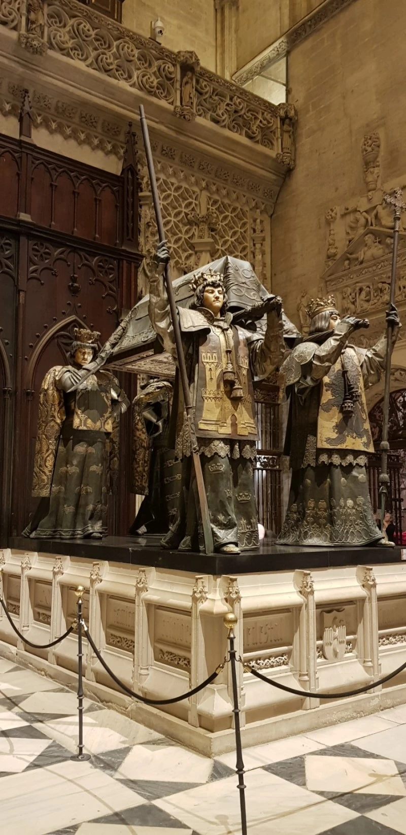 에스파냐 4 왕국. 레온, 카스티야, 나바라, 아라곤을 상징하는 조각상이 콜럼버스의 관을 떠받들고 있다.