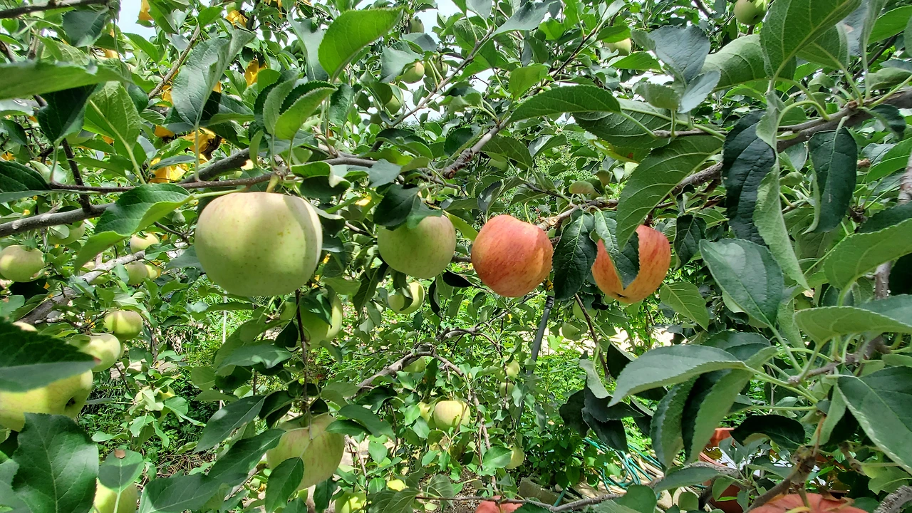9월 초순 부사는 여전히 푸르지만, 홍로는 붉게 물들고 맛이 들어 수확을 기다린다.