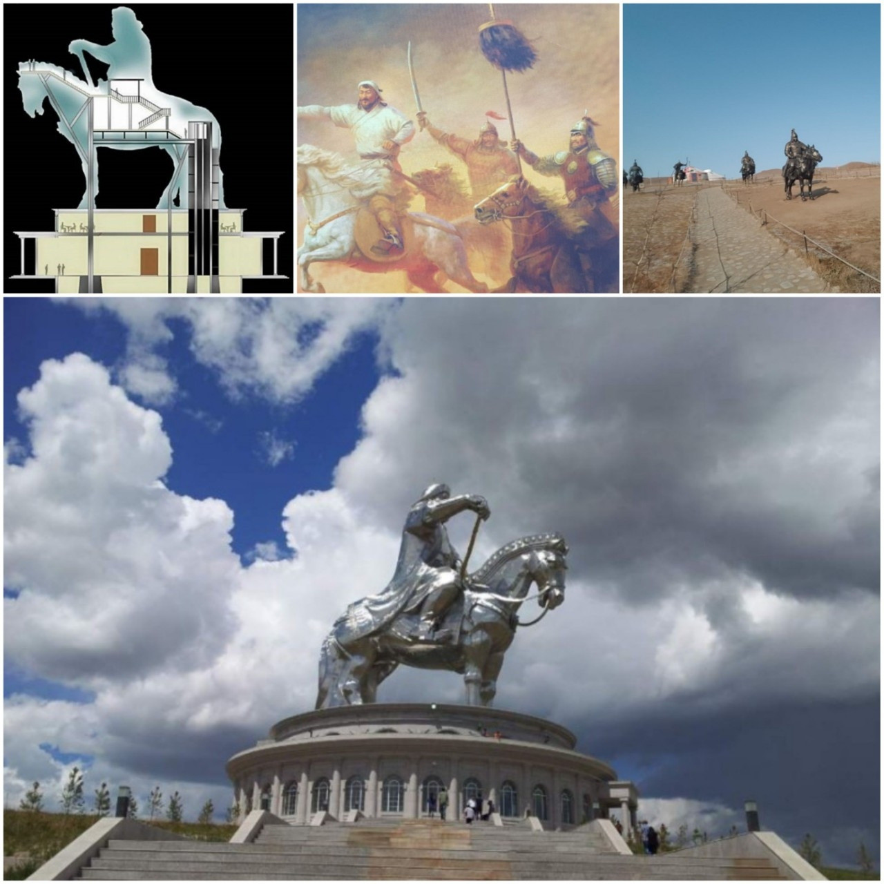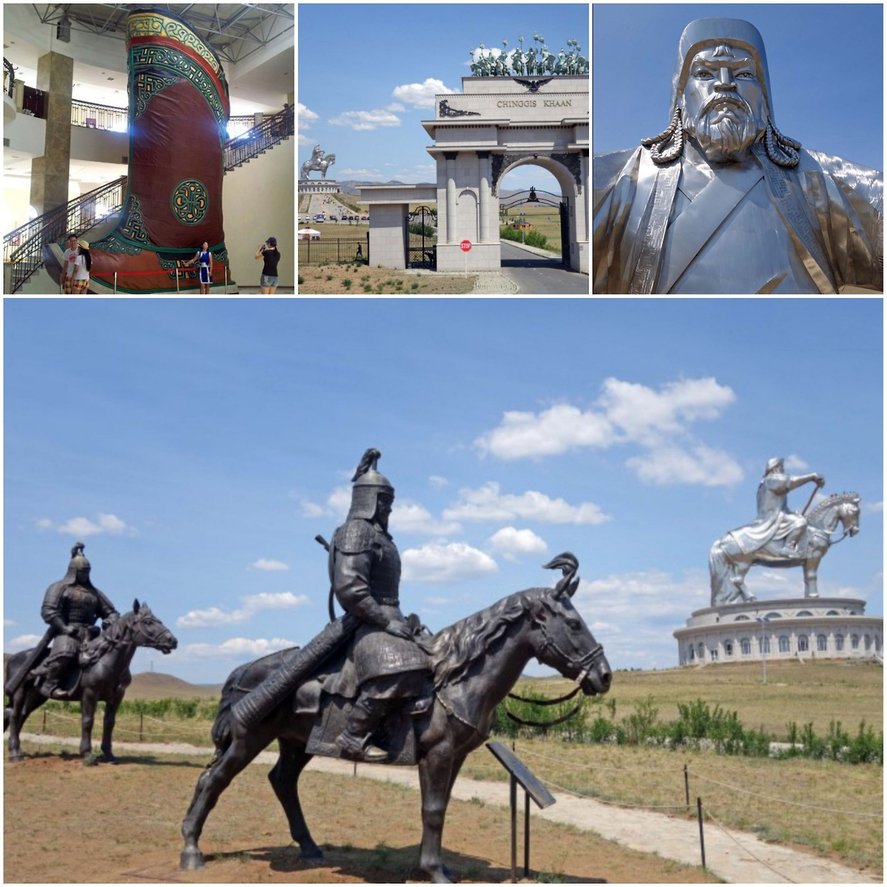끝없는 지평선을 달리다가 40m 칭기즈칸 동상이 우뚝 선 박물관에 들렸다. 2006년 몽골 통합 800주년을 기념해 세운 동상이다. 러시아, 일본, 독일, 한국 기술자가 철 250톤으로 거대 기념탑과 야외 박물관을 만들기 시작하여 2010년에 완공했다. 엄청난 규모라 동상 내부 엘리베이터를 타고 동상 얼굴 부분까지 올라가서 사진을 찍을 수 있었다. 현재까지도 주변 기념사업을 확장하고 있다. 모금액을 기탁하는 사람들에게는 그들의 얼굴 모습을 한 기마동상을 만들어 기념광장의 영구히 배치해 준다고 한다. 중국 배우 성룡도 기탁금을 내서 조만간 그의 얼굴을 한 기마동상이 세워질 것이란다.