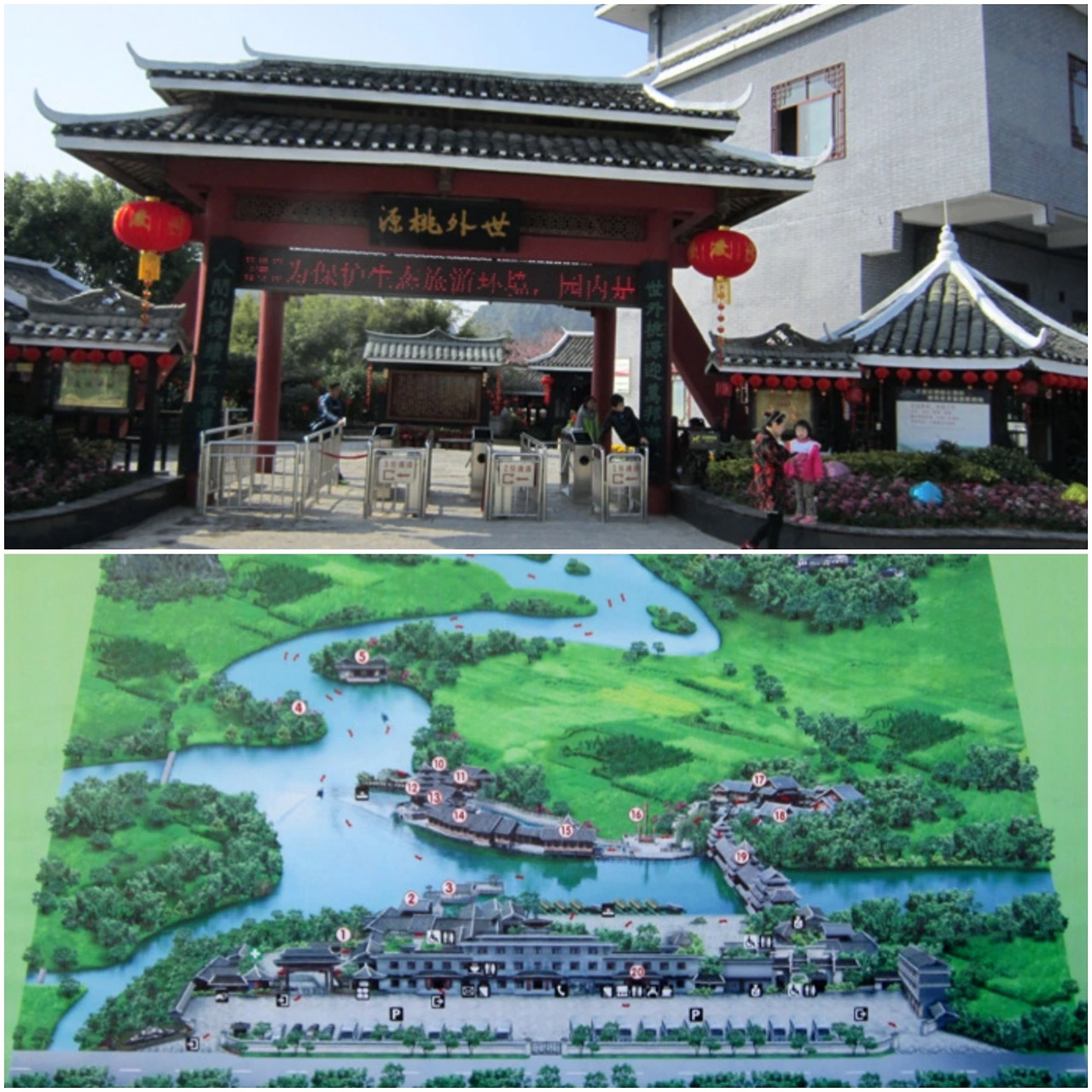 다시 장소를 옮겨 찾아간 곳은 시인 도연명이 지은 '도화원가'에서 전해 내려온 이상형의 도시가 펼쳐진다는 세외도원이다. 산수의 아름다움이 천하제일이라는 계림의 양삭에 세상 밖 복숭아 정원이 조성되었다. 필가산 일대의 10여 리 주변에 심어 놓은 복숭아꽃 도화가 만발하고, 황금색 유자나무 꽃과 눈처럼 흰 여채화와 자홍색의 홍화초가 온통 주변을 장식하고 있었다. 마치 알록달록 오채 색이 섞인 비단이 펼쳐지는 듯하다고 비유할 수 있겠다. 배를 타고 이 동네를 한 바퀴 돌았다.