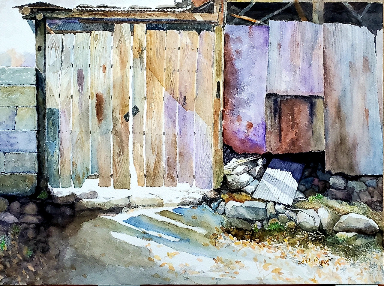 (*) 이 그림은 처음부터 작정을 하고 시간을 충분히 잡고 디테일하게 그려 나갔다. 송판의 나무 나이테와 바닥에 뒹구는 낙엽들을 하나하나 그렸다. 그림자와 대비하여 대문 사이로 비껴 들어오는 햇빛을 강조하는데 집중했다. 그리고 그림의 마무리를 위해 주저 없이 사인을 했다. 지난번 그림에서는 폼나는 사인을 찾아내지 못해서 거의 한 달간 사인을 하지 못하고 망설였지만, 마침내 그림을 헤치지 않는 사인이라면 어떤 것도 괜찮다는 결론을 얻었다. 이번 그림에는 낙엽들 사이에 티 나지 않은 색상으로 사인을 하고 마무리했다.